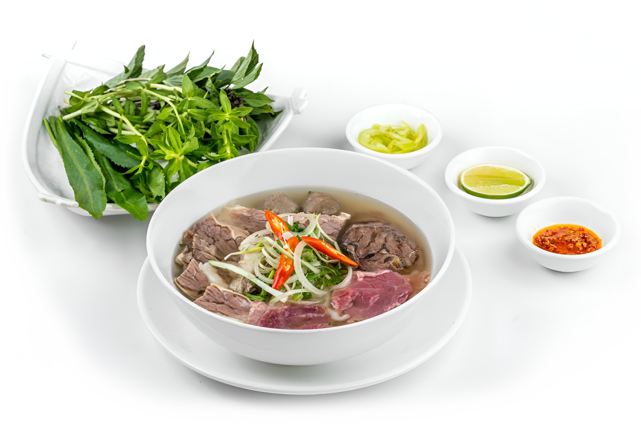 We serve Phở with a large side helping of Vietnamese herbs which we grow ourselves as well as lime, fresh chilli and lemongrass and chilli paste. Add the herbs and flavourings you want and dip in fish sauce or chilli paste for extra seasoning.