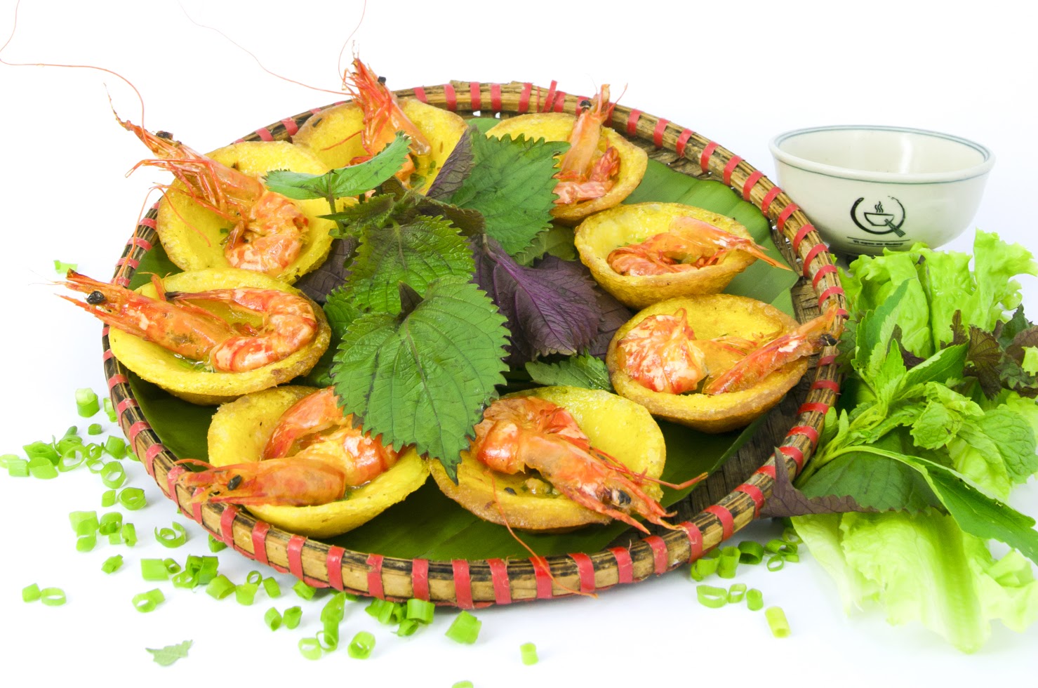 Banh Khot is a wonderful dish which comes from Vung Tau, the port and beach resort not far from Saigon. Bite-sized egg and flour cakes are fried in hot oil to a crisp and topped with small fresh shrimp; the whole business often wrapped in lettuce leaves for dipping in a dedicated variety of nuoc cham.