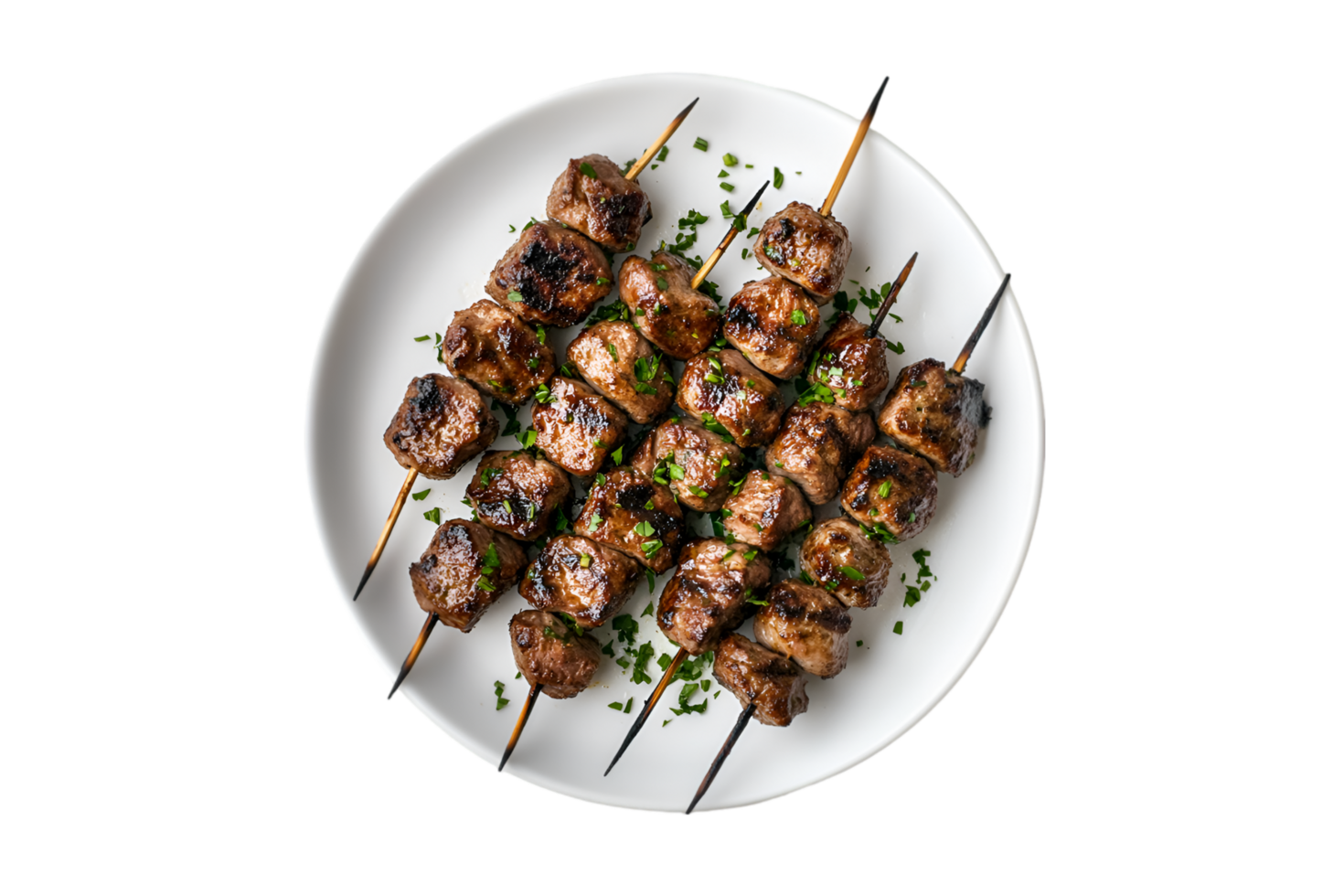 Fillet of grass-fed beef, cubed and marinated in home-grown Vietnamese basil and mint with Kampot pepper, chili and soy sauce. Charcoal grilled on skewers with pineapple, green pepper, tomato and onion.