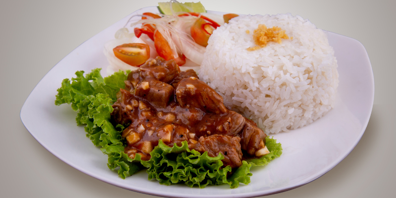 Lok lak is a simple yet flavorful dish made with marinated beef, stir-fried and served with rice, fresh vegetables, and a pepper-lime dipping sauce.